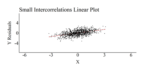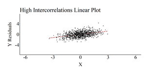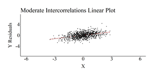 The correlation matrices were then produced, the OLS regression models were estimated, and scatterplots of the association between X and Y (Residuals)after adjusting for Z1 through Z4 were created. The results of the regression model estimated on the simulated data with moderately small intercorrelation demonstrated only a slight upward bias (Estimated b = .52; True b = .50). Nevertheless, the regression model estimated using the simulated data with moderate intercorrelation demonstrated a .20 upward departure from the true slope coefficient (Estimated b = .70; True b = .50) and the regression model estimated using the simulated data with high intercorrelation demonstrated a .82 upward departure from the true slope coefficient (Estimated b = 1.32; True b = .50).