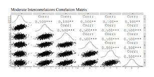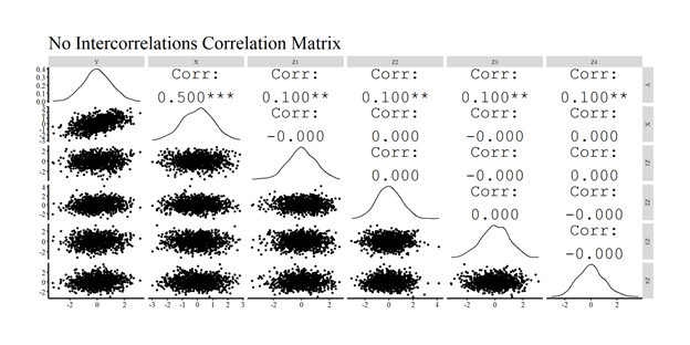 For our second simulation, we will replicate the first simulation except slightly increase the correlation among the independent variables (X and Z1–Z4). Specifically, in the first simulation we specified that X and Z1–Z4 were uncorrelated, while in the second simulation we indicate that X and Z1–Z4 are intercorrelated at .10 (i.e., every cell containing a zero in the previous simulation was specified to be .10 in the current simulation). Importantly, the relationship between X and Y was specified to be .50. The visual correlation matrix was then recreated. The correlation matrix of the simulated data perfectly matched our specifications.