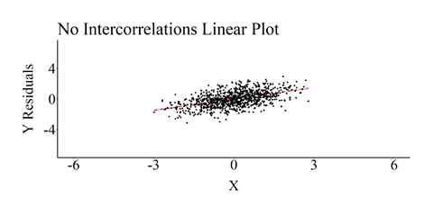The OLS regression model was then reestimated and we recreated a scatterplot of the association, including the linear regression line, between X and Y (Residuals)after adjusting for Z1 through Z4. Although not a noticeable deviation from the specification, the estimated association between X and Y was .484 (not .50 like the specification).