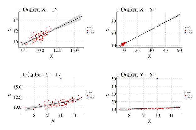 Consistent with the previous examples, we replicated the no outlier code except added a single outlier (ID: 101) to the data frame that was specified to have a value of 16 on X and 11.01 (Ybar) on Y. After creating the sample, we replicated the linear OLS regression model. Distinct from the previous examples, however, the slope coefficient is downwardly biased (b = .3970) compared to the true slope coefficient (.5934). The downward bias in the slope coefficient becomes more substantial, however, when the X value is increased.
