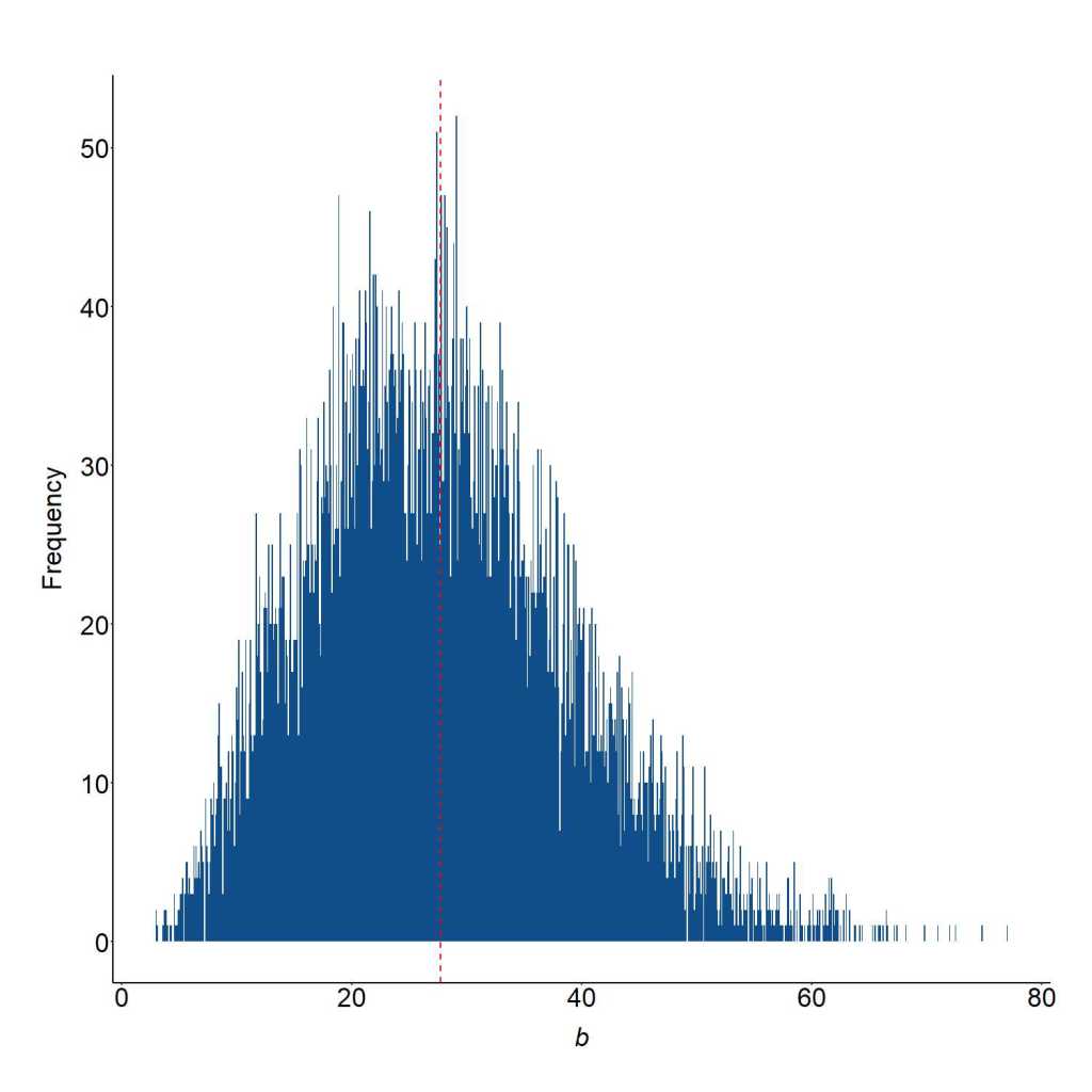As illustrated in the figure below, the misidentification of the structural association where Y1 was regressed on X1, as well as all EX1 and LEN7, produced an average slope coefficient of b = 27.74. This suggests that a 1 point increase in X1 directly causes a 27.74 increase in Y1, on average. As a reminder, the true slope coefficient is 1.00. We will begin exploring structural specifications in Misidentification 4!