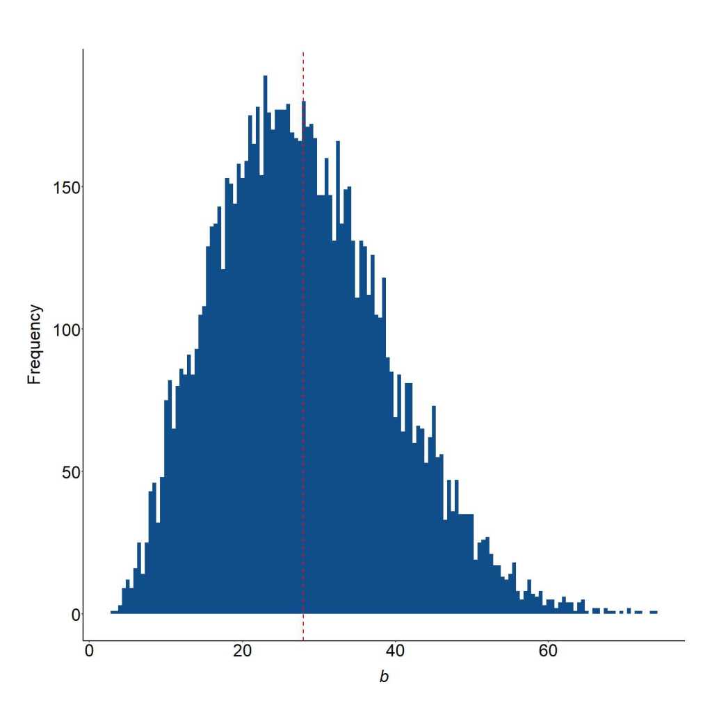 As illustrated in the figure below, the misidentification of the structural association where Y1 was regressed on X1, EN7-EN12 was regressed on on X1, and covaried the residuals of Y1 and EN7-EN12, produced an average slope coefficient of b = 27.96. This suggests that a 1 point increase in X1 directly causes a 27.96 increase in Y1, on average. As a reminder, the true slope coefficient is 1.00.