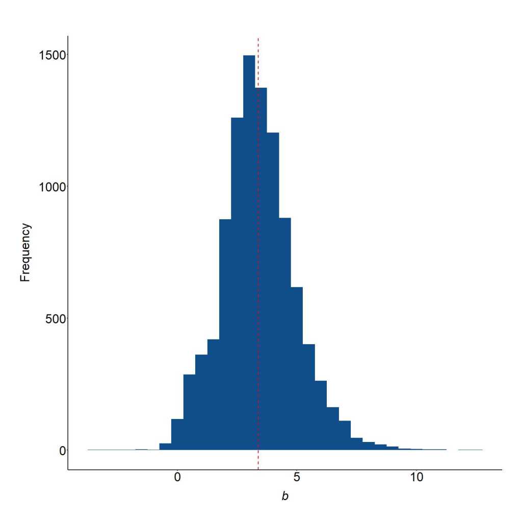 As illustrated in the figure below, the misidentification of the structural association where X1 on EX31-EX33, Y1 on X1 and LEN1-LEN4, produced an average slope coefficient of b = 3.387 for the relationship between X1 and Y1. This suggests that a 1 point increase in X1 directly causes a 3.387 increase in Y1, on average. Considering the past models, this is extremely close to the true direct effect of X1 on Y1 (As a reminder, the true slope coefficient is 1.00).