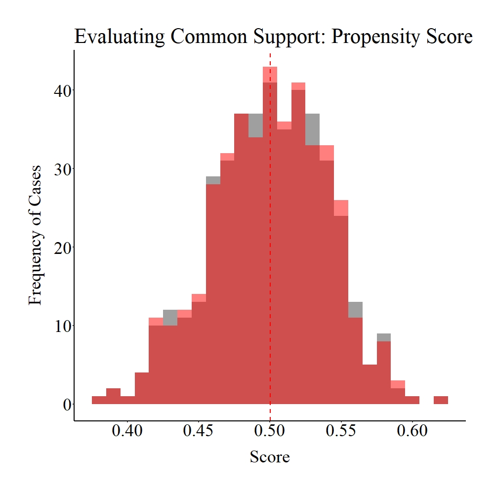 As it can be observed below, while common support (dark red) does exist between the treatment (gray) and control (light red) groups, the number of cases that fall into the region of common support is quite limited compared to the overall sample size (N = 1,000). I define this condition – some might disagree – as weak common support between the treatment and control groups.