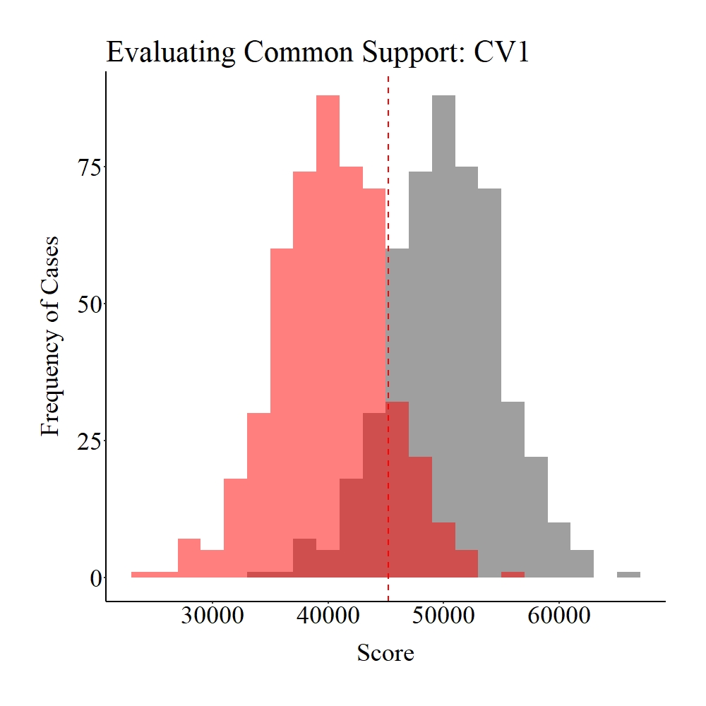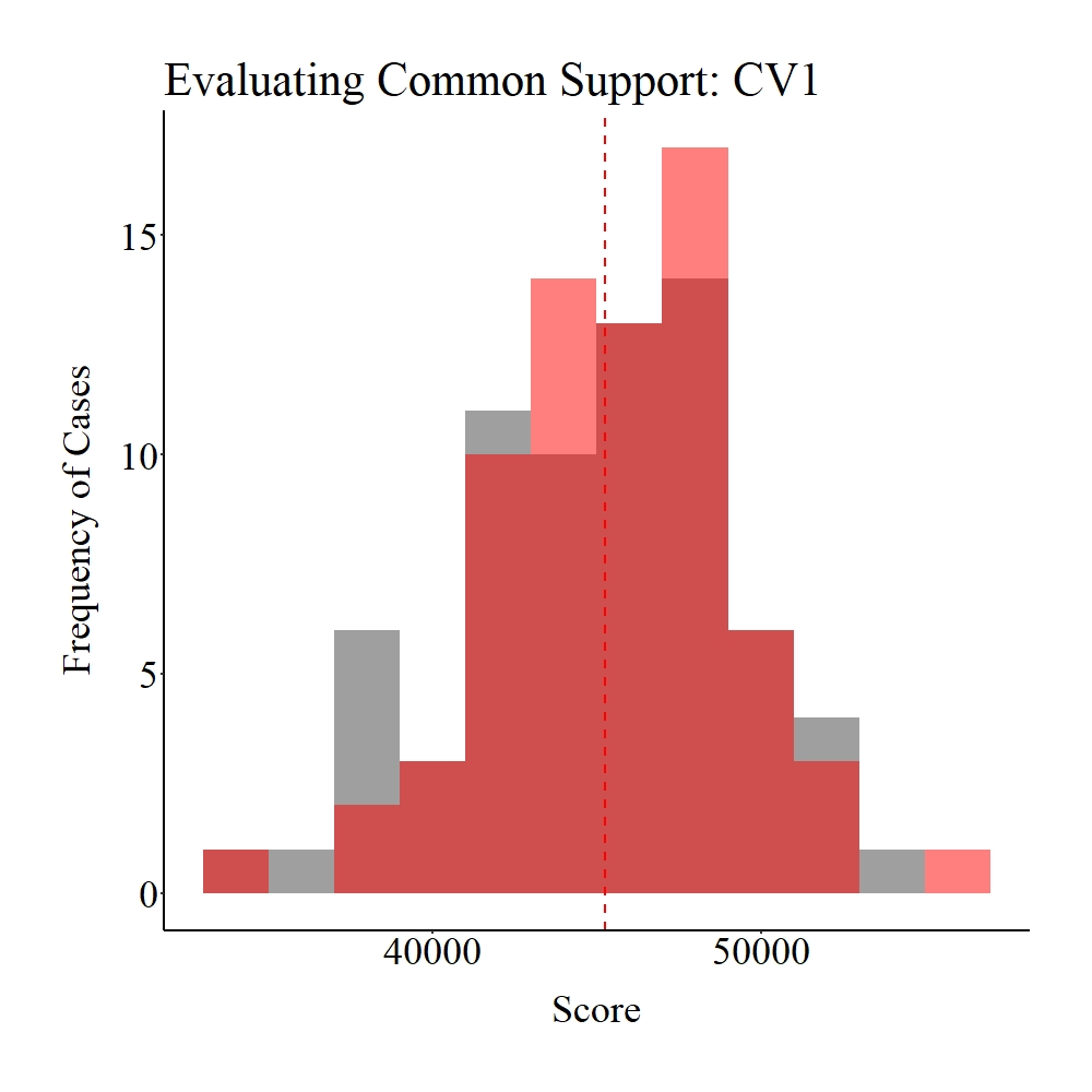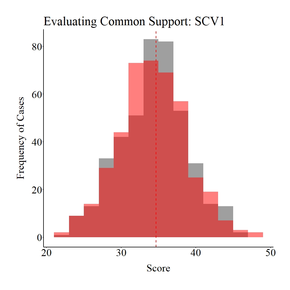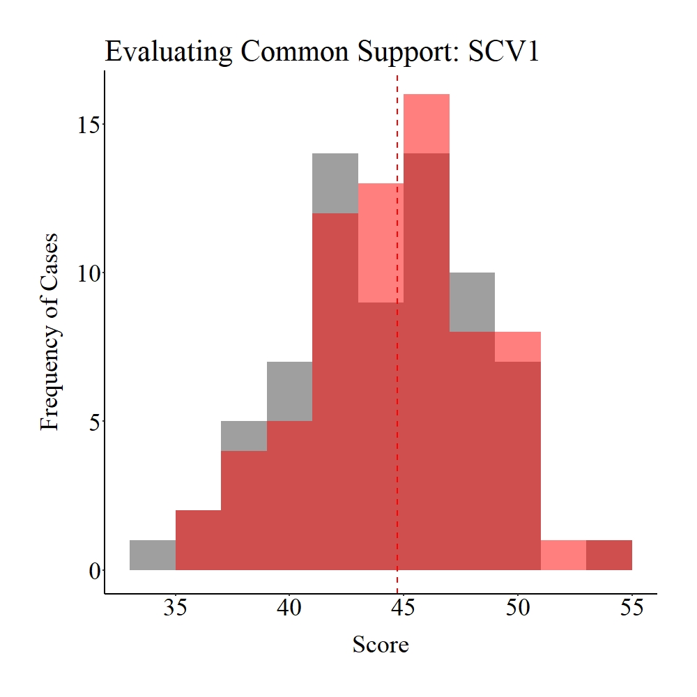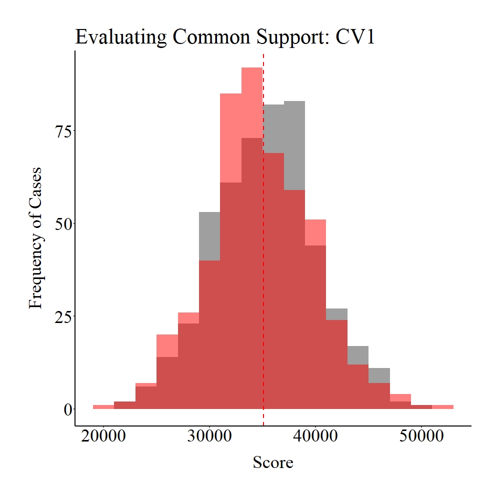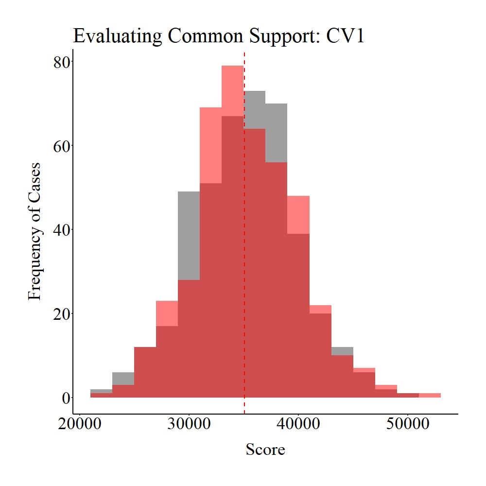 Now let’s explore the common support between the treatment and control cases on SCV1 and CV1. Panel A illustrates the common support for SCV1, while Panel B illustrates the common support for SCV1. The gray area in the figures below represents the treatment cases, the light red area represents the control cases, and the dark red represents the distributional overlap between the treatment and control groups. As it can be observed, a large amount of support (i.e., distributional overlap) exists between the treatment and control groups on both SCV1 and CV1, which suggests that we have satisfied the assumption of common support.