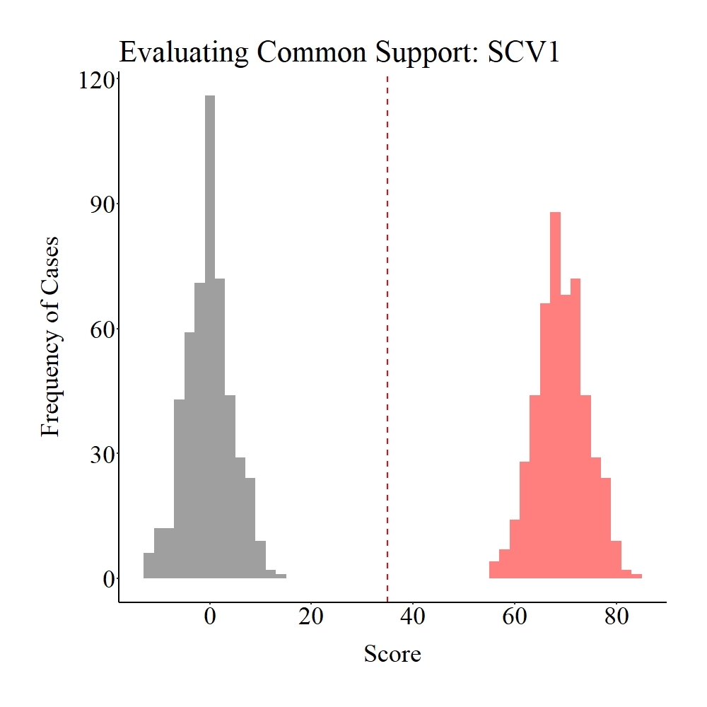 Now let’s evaluate the common support in the population. As you probably guessed – and consistent with the data specifications –, there is no distributional overlap on SCV1 and CV1 between the treatment (gray) and control (light red) groups.