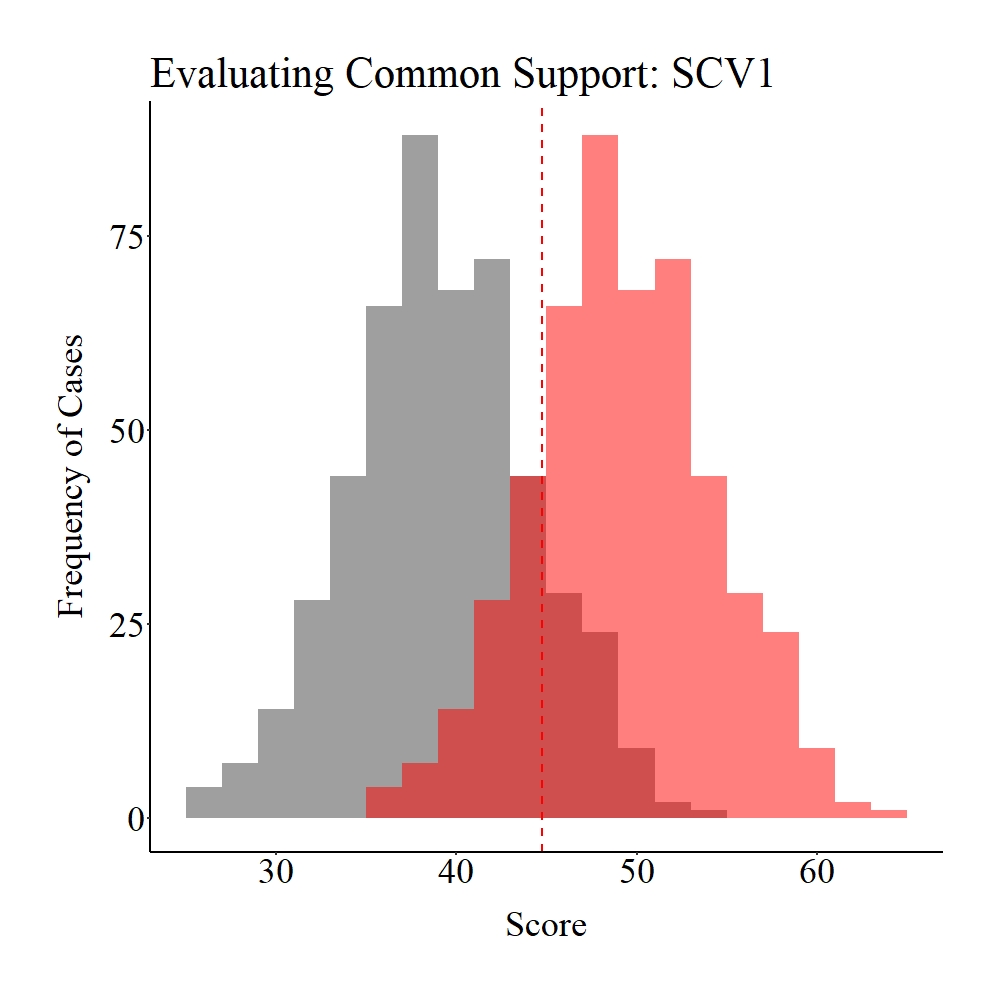 Quasi-experimental matching techniques are designed to match treatment to similar control participants to approximate the counterfactual condition created when a true experiment is conducted. Although the process of matching can vary drastically, every procedure requires the treatment and control cases to be similar enough to match. The more similar the treatment and control cases are, the easier it is to match. If the treatment and control groups have no overlapping characteristics, however, a counterfactual condition cannot be generated through matching. This is the assumption of common support. Explicitly, we assume that enough distributional overlap exists between the treatment and control groups to permit the matching of participants. Within the context of propensity score matching, the assumption of common support requires users to have a large amount of distributional overlap between the treatment and control groups on all of the matching constructs as well as the predicted probabilities. When weak or no common support exists between the treatment and control groups, we have violated the assumption of common support and will produce biased post-matching estimates (if we even have any appropriate matches).