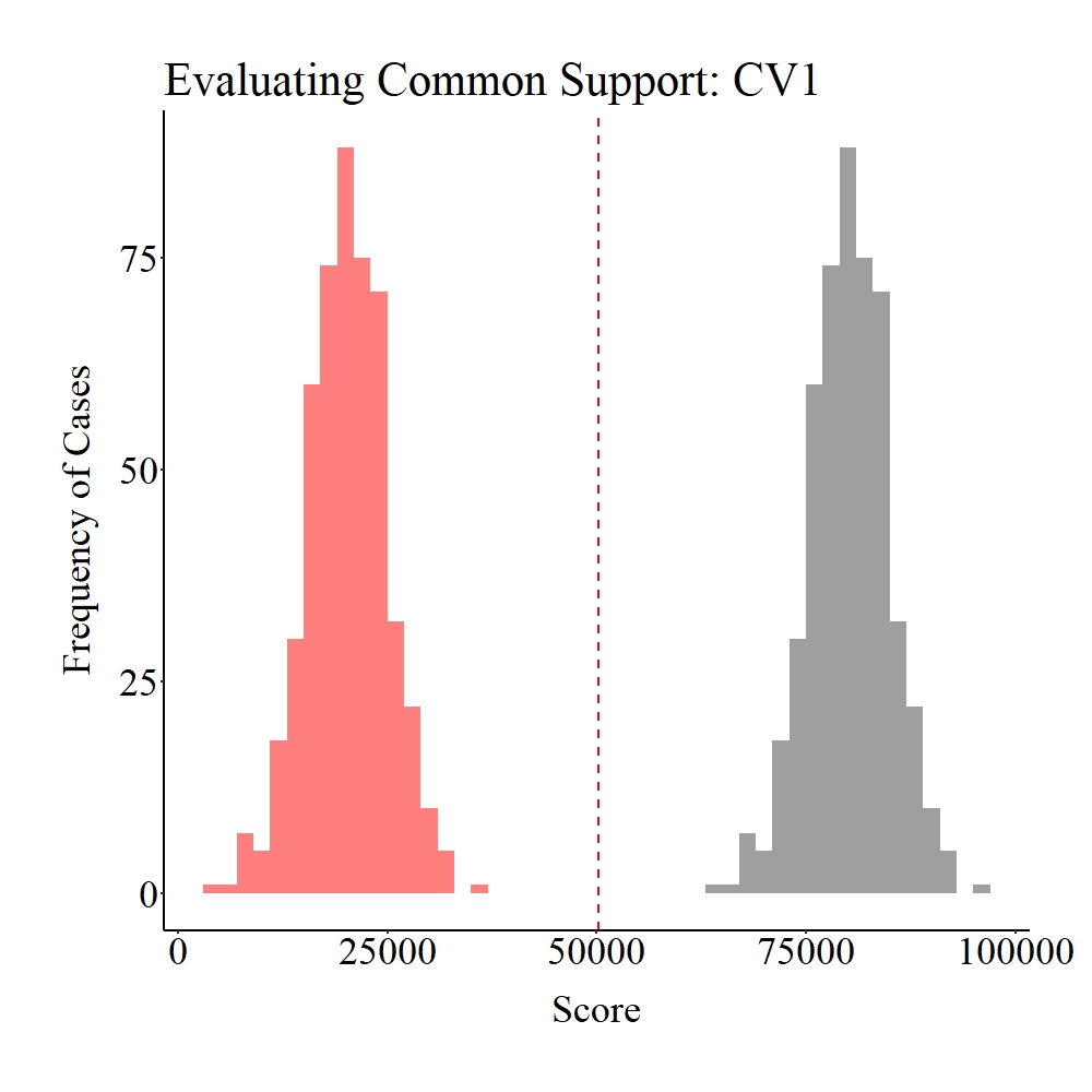 To simulate data without any support between the treatment and control groups, we will have to alter our simulation process slightly. The easiest way to proceed is by simulating the treatment cases and the control cases separately, merging the datasets, and then generating the outcome of interest (Y). For the 500 treatment cases, SCV1 was specified to be a normally distributed variable with a mean of 0 and standard deviation of 5, while CV1 was specified to be a normally distribution variable with a mean of 80000 and a standard deviation of 5000. Given that this dataframe represented the treatment cases, all of the cases were exposed to the treatment (i.e., received a value of “1” on TDI).