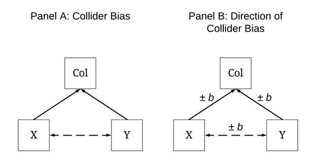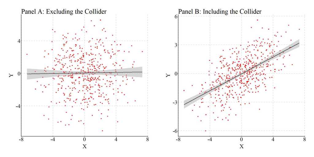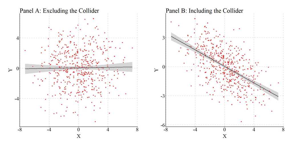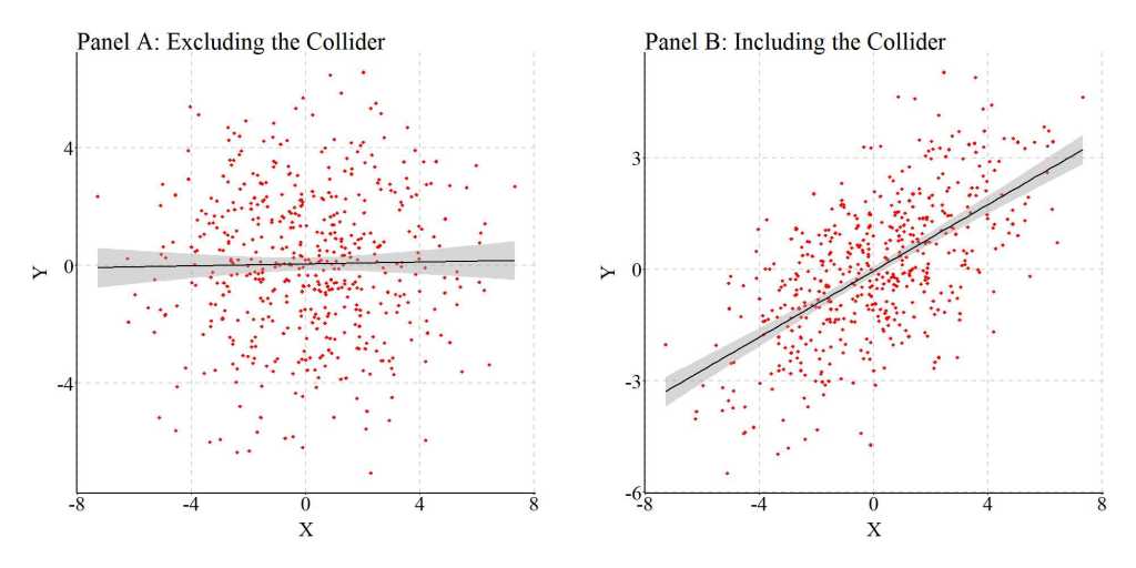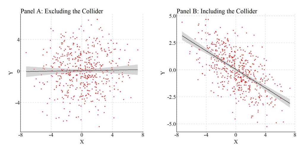 As demonstrated throughout Entry 8, accidentally conditioning an association of interest upon a collider – a variable causally influenced by both the independent and dependent variable – can introduce bias into the statistical estimates generated from our models. The estimated slope coefficients can be upwardly biased (further from zero than the true slope coefficient) or downwardly biased (closer to zero than the true slope coefficient) and in the same direction (e.g., positive true b and positive estimated b) or opposite direction (e.g., positive true b, but negative estimated b) conditional upon the interrelationship between the variables. Considering this, scholars should always express caution when selecting variables to include in multivariable statistical models. The likelihood of accidentally including a collider between an independent variable and the dependent variable in a multivariable regression model is substantively higher than we perceive.