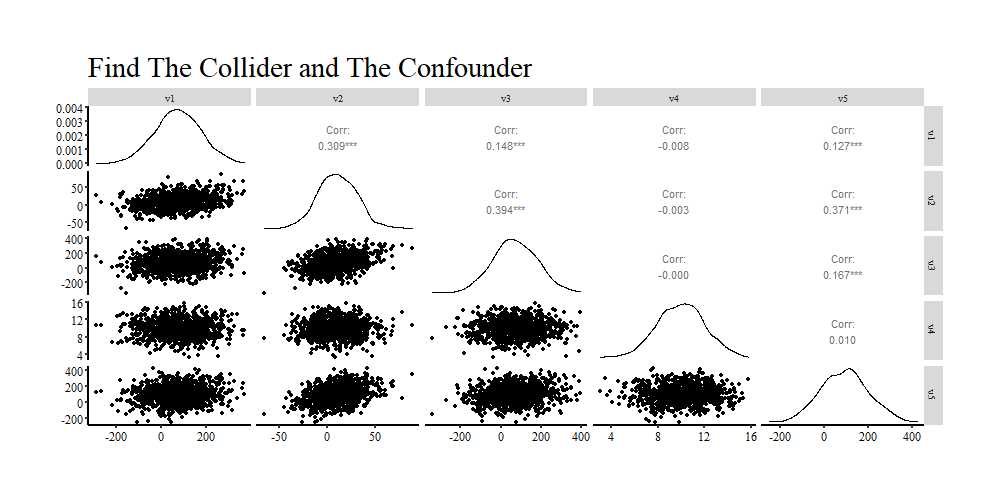 So… in the previous entry we did not discuss the variety of statistical techniques used to identify a confounder between an independent and dependent variable. This is because scholars commonly rely on bivariate statistics to identify potential confounders. This is not an appropriate technique for a variety of reasons – including variables can become confounders only within the context of a multivariable model (this will be discussed in future entries) –, but the primary reason is that colliders and confounders look extremely similar in correlation matrices and other bivariate statistics. Look at the figure below and (1) identify the relationship confounded and which variable is confounding the association?, as well as (2) identify the collider and the two variables causing variation in the collider? Any ideas? I bet you thought V3 is the collider between V1 and V2… hmm, though V5 is related to every variable? If you can correctly identify both the confounder and the collider from a correlation matrix you have a super power and should monetize that immediately! For the rest of us, identifying the confounders and colliders requires a sound theoretical model and a directed acyclic graph (DAG). While the stepwise estimation of regression models including and excluding every variable (one at a time) might appear to be a valid technique for identifying confounders and colliders, be careful as you could end up p-hacking a model.