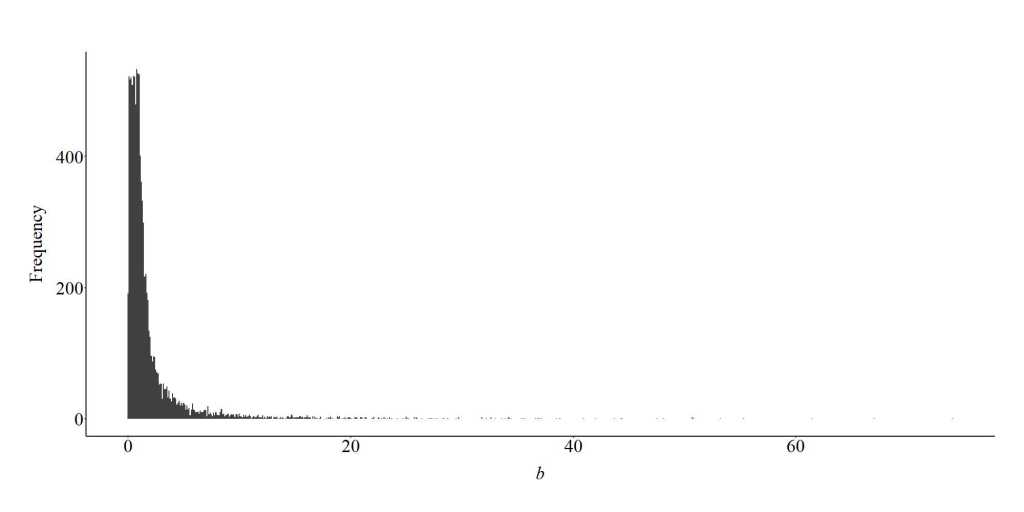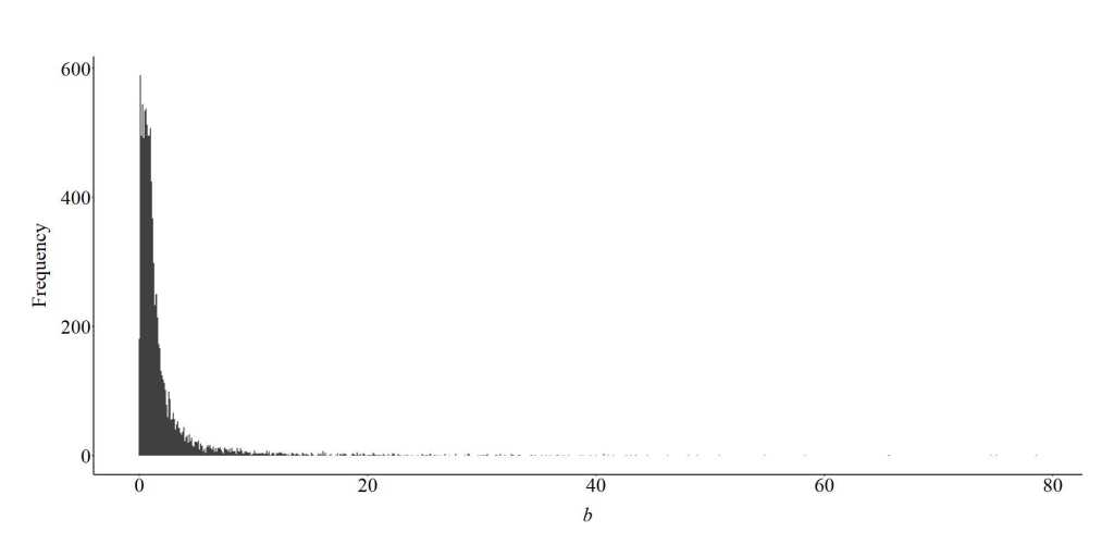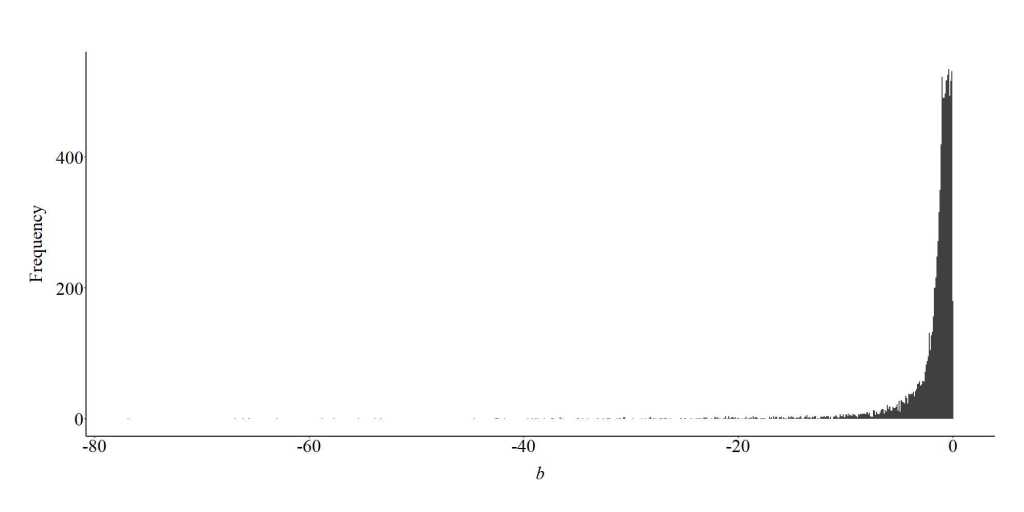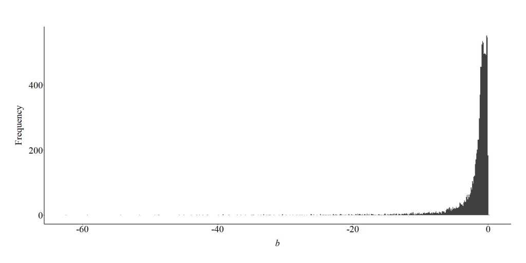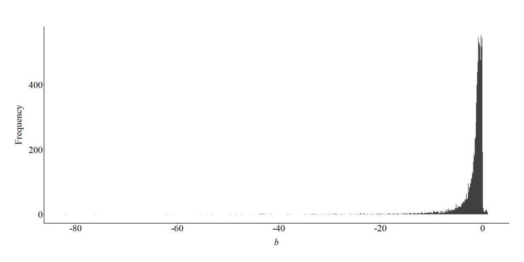 To further demonstrate the bias generated from the inclusion of a collider in a multivariable regression model, we can specify a looped simulation analysis. For the looped simulation analysis, we told the computer to conduct 10,000 simulations (n), where the slope coefficient of the association between X and C, and Y and C, randomly varied between 1 and 100 on a uniform distribution. Moreover, the number of cases in the simulation were randomly selected between 100 and 1000 (on a uniform distribution), and the distribution of X, Y, and C were randomly specified to have a mean between -5 and 5 on a uniform distribution and a standard deviation between 1 and 5 on a uniform distribution. After simulating the data, a regression model was estimated where the slope coefficient of the association between X and Y was adjusted for the influence of C. The estimated slope coefficient was than recorded and used to generate the plot below.