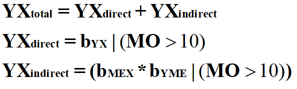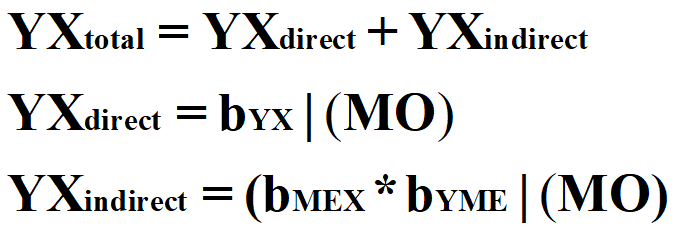 Now let’s estimate some effects, starting with the unconditional total causal effects. The total unconditional causal effects represent the combination of all of the effects of X on Y and is calculated using the equations below.[i] Explicitly, the unconditional total causal effect of X on Y is equal to the direct causal effect of X on Y plus the indirect causal effect of X on Y. The direct causal effect of X on Y is the value of bYX across the entire distribution of MO, while the indirect causal effects of X on Y is bMEX multiplied by BYME across the entire distribution of MO.