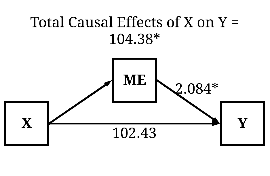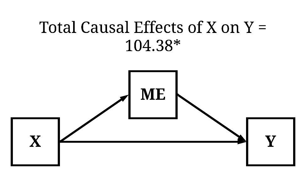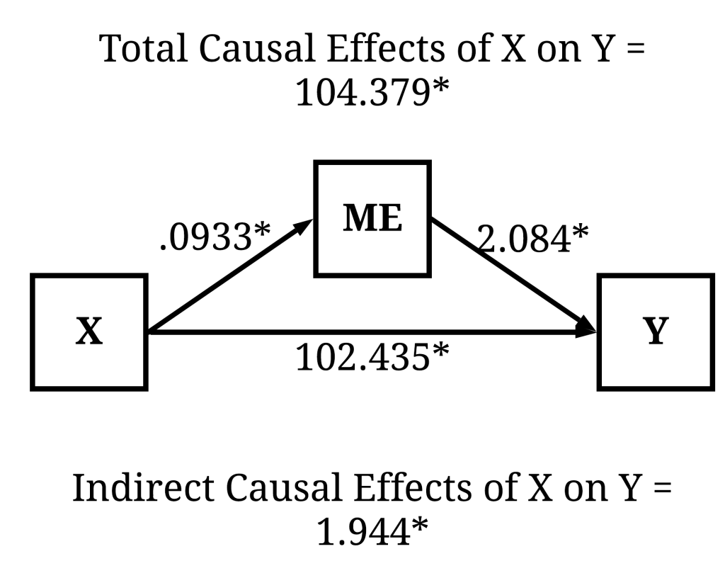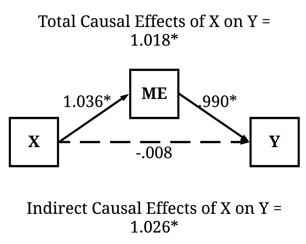 Now, imagine we regressed Y on X but accidentally included ME as a statistical control. The inclusion of ME as a statistical control adjusts the regression estimates, where the observed coefficients of the effects of X on Y only represent the direct causal effects. In this example, consistent with the results presented below, variation in X does not directly cause variation in Y. As such, the accidental inclusion of ME in the regression analysis would generate the interpretation – if we are only interested in the total causal effects – that variation in X does not causally influence variation in Y. This interpretation, however, only exists because the estimated coefficients represent the direct causal effects – not the total causal effects –, which occurred because ME was included as a covariate in the regression model. As such, the statistical coefficient violates the assumption stated within our hypothesis or research question.