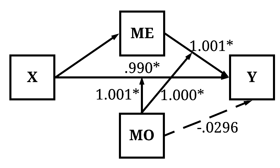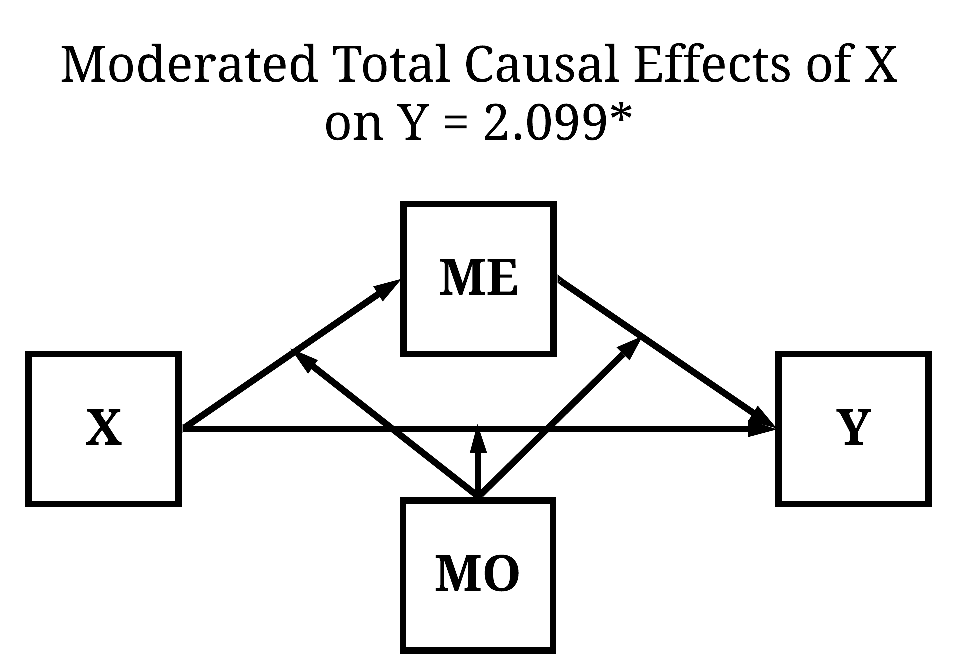 Instead, we can calculate the conditional total causal effects of X on Y by regressing Y on X, MO, and an interaction between MO and X. Ignoring the direct estimates – they provide limited value in an interaction model –, the interaction between MO and X indicates that as scores on X increase and scores on MO increase the magnitude of the total causal effects of X on Y becomes stronger to a degree of 2.099 (b = 2.099, β = .152).