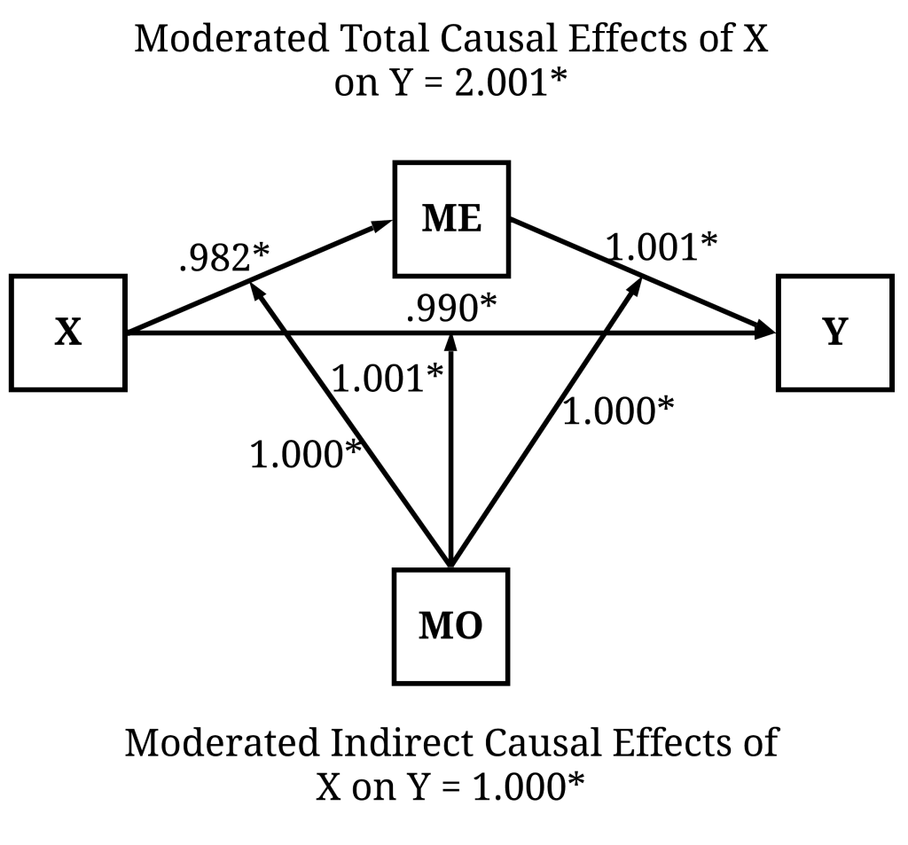 By estimating the OLS regression model of Y on X with only cases that had a value on MO > 10, a unique estimate for the total causal effects of X on Y is produced. Specifically, for cases with values on MO > 10, a 1 point increase in X causes a 296.721 increase in Y (β = .843). Given that MO is a continuous construct, we can calculate conditional total causal effects of X on Y across the entire distribution of MO – we, however, won’t do that because it requires the estimation of numerous regression models.