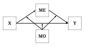 For the purposes of the current demonstration, the data simulation will specify that the total causal effects of X on Y is a combination of all of the causal pathways that can exist. Explicitly, following the diagram below, a direct causal effect and an indirect causal effect – through ME – were specified to exist from X to Y, the effects of which are moderated by scores on MO. The employment of a single structural causal network permits us to generate estimates for all of the causal effects of X on Y, as well as illustrate the differences between the causal estimates.