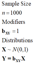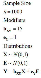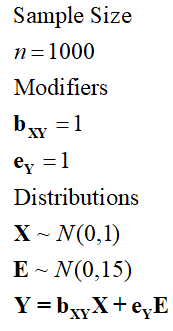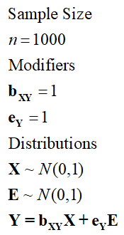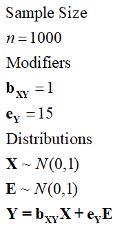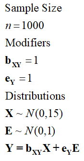 For this next simulation, we want approximately 50 percent of the variation in Y to be caused by variation in X and approximately 50 percent of the variation in Y to be caused by variation in E. E in this example – and all simulation specifications from here on – is used to specify the amount of residual error (or variation) in the dependent variable. When simulating data with multiple dependent variables EYk will be used to represent the residual error term. ey represents the modifier for E. To achieve this, following principles 2 and 3, we want the standard deviation and modifier for X to be identical to the standard deviation and modifier for E (as detailed in Specification 2).
