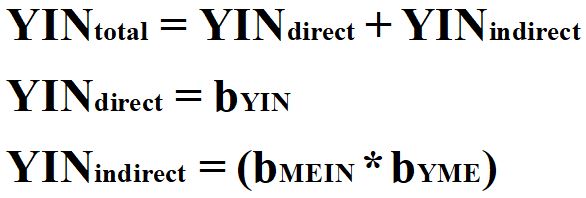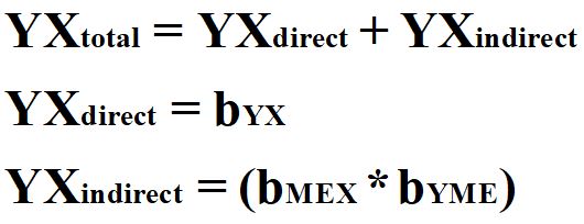 As one can recognized, it is quite difficult to identify a construct that satisfies the requirements of an instrumental variable. These requirements, however, serve a valuable purpose when trying to generate causal inferences about the effects of X on Y. In particular, by finding the perfect instrument, one can estimate the causal effects of X on Y (bYX) without observing the known or unknown mechanisms confounding the association. To demonstrate how instrumental variable analysis works, let’s briefly review how to calculate the total, direct, and indirect effects of one construct on another construct. As presented in Equation 1, the total effect of X on Y is equal to the direct effect (bYX) of X on Y plus the indirect effect of X on Y (bMEX*bYME). The indirect effect is calculated as the effects of X on the mediator (ME) multiplied by the effects of the mediator (ME) on Y.