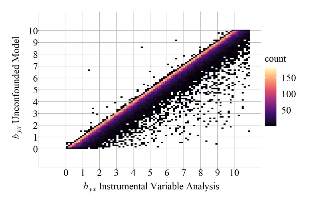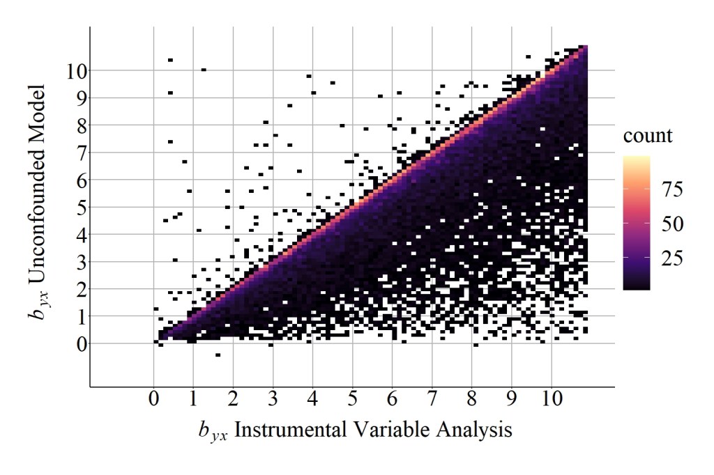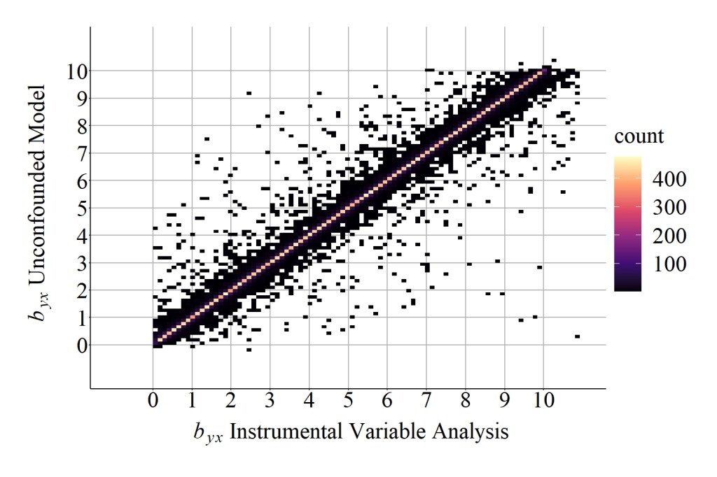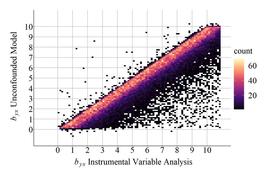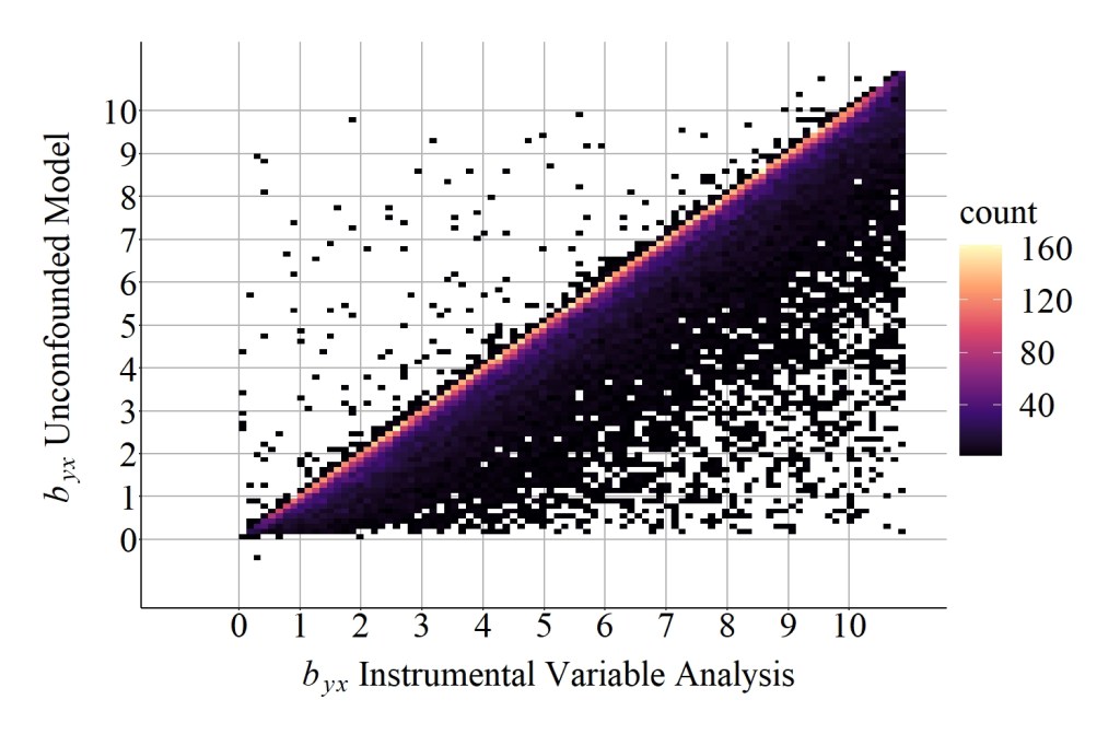 Due to concerns about the length of this entry – and the complexity of the analyses – I could not provide a comprehensive review of the results that is warranted. However, there are two important patterns that need to be highlighted to guide the conclusion. First, evident in Figure 6, a normal distribution appeared in the plot, where the highest density of bYX were the same value for both the unconfounded model and the instrumental variable analysis. This pattern is distinct from the results in figures 7-10, where it appears that the slope coefficient produced by the instrumental variable analysis was primarily upwardly biased (i.e., further from zero than the slope coefficient produced by the unconfounded model). Second, although not visually displayed, the range of differences between the bYX produced by the unconfounded model and the bYX produced by the instrumental variable analysis was substantially wider for the simulations with instrumental variables that did not satisfy the requirements of an instrument. These results, overall, demonstrate that the causal effects of X on Y can be estimated using an instrumental variable analysis when employing a construct that satisfies the requirements of an instrument. Nevertheless, when the construct does not satisfy the requirements of an instrument, the estimated effects of X on Y produced by an instrumental variable analysis is commonly upwardly biased – further from zero than the true causal effects.