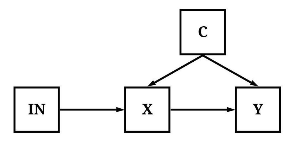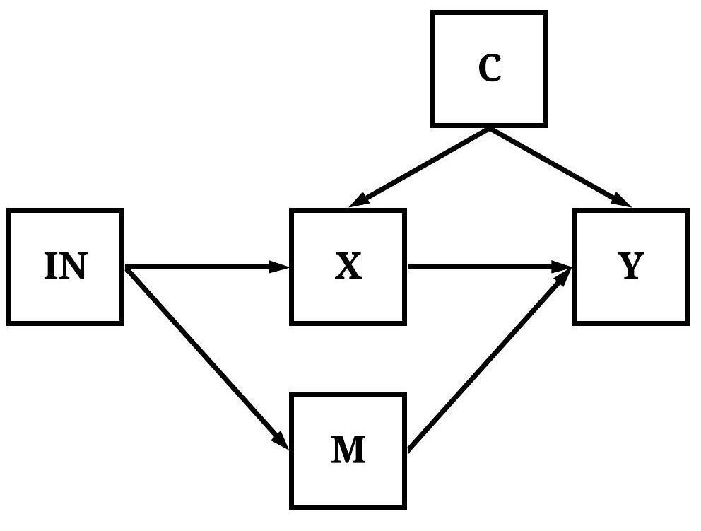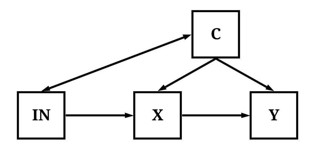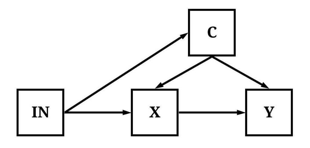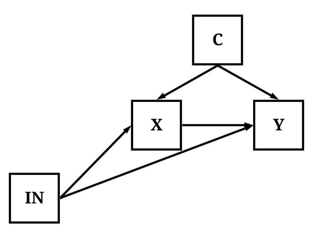 Let’s take a moment to define instrumental variables and identify constructs that can be categorized as instruments. A construct can be employed as an instrument when: (1) the variation in the construct directly causes variation in the independent variable, (2) the variation in a construct is uncorrelated with any confounders, (3) the variation in the construct does not directly cause variation in the dependent variable, and (4) the variation in the construct does not have any other indirect causal influence on the dependent variable (Figure 1). As illustrated below, IN satisfies these requirements, making it an instrument for the association between X and Y, which permits the estimation of an instrumental variable analysis.