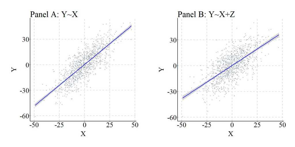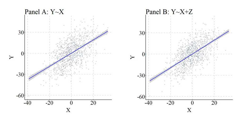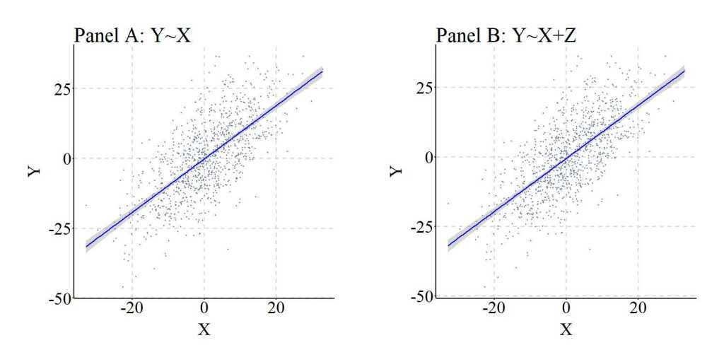 Evident by the results of the models, the slope coefficient of the association between X and Y was .97509 when Z was not included in the model, and .97368 when Z was included as a covariate in the model. Again, the slight difference is the product of shared variation between X, Y, and Z.