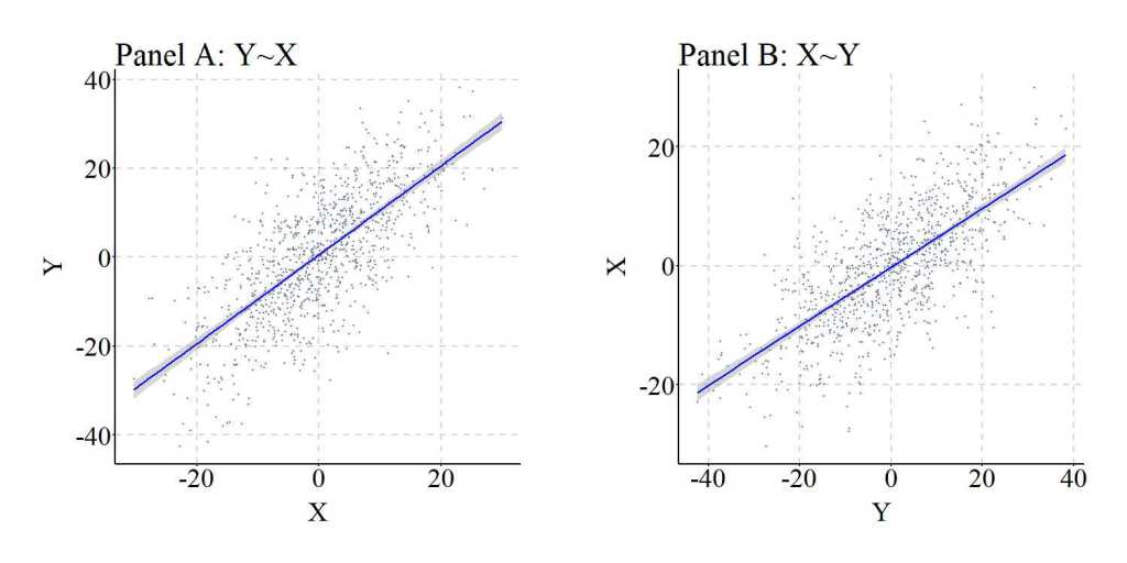 Although the lines appear to be identical, it is important to note that the x and y-axes switch from Panel A to Panel B. Notably, independent of the exact slope coefficients, the results in Figure 6 further solidify the suggestion that variation in X causes variation in Y and variation in Y causes variation in X. This interpretation, however, is incorrect as it does not align with the simulation specification.