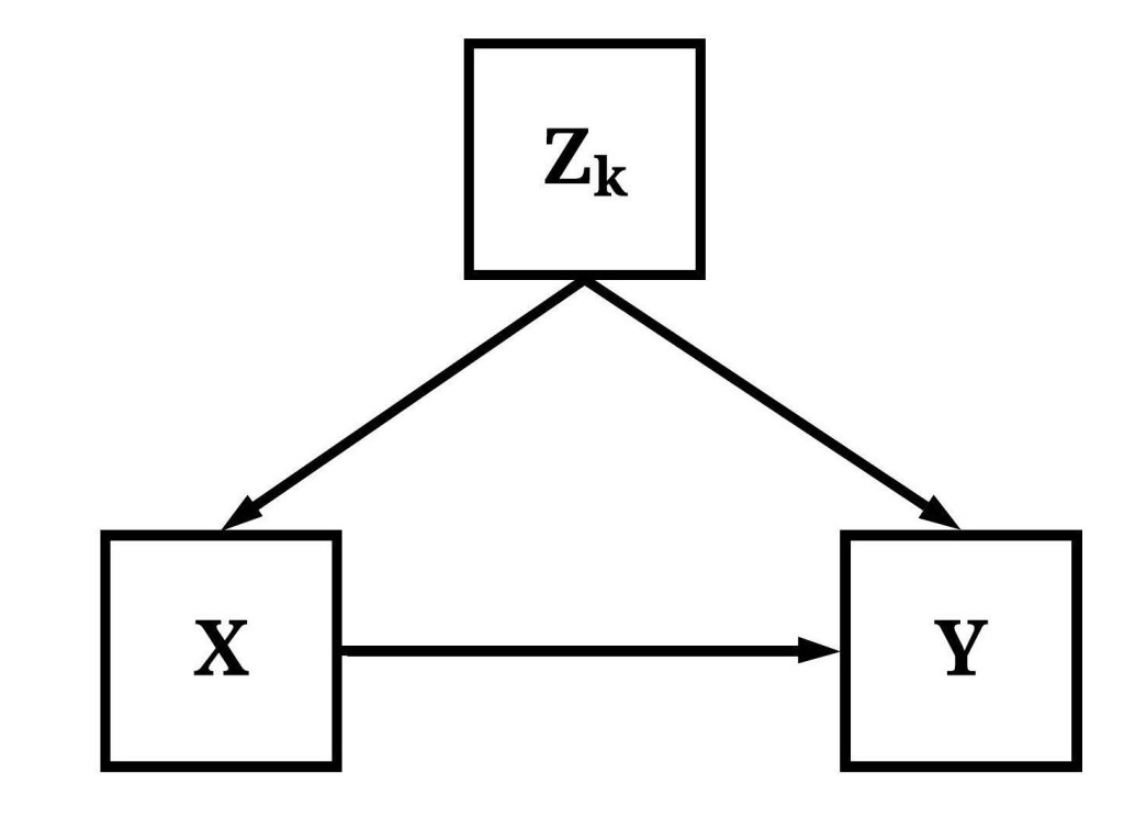 If Equation 1 intrinsically expresses our belief that variation in X causes variation in Y – i.e., a causal statement of how the world works –, what does Equation 2 express? Following the same logic, the inclusion of a covariate inherently expresses the believe that variation in Zk (i.e., covariates) causes variation in both X and Y. Specifically, the inclusion of any Zk expresses that we believe the association between X and Y can not be properly estimated without adjusting for the variation associated with Zk. Here, Equation 2 is equivalent to Figure 5.