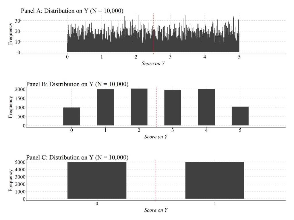 Now, let’s focus on Panel B, where scores on Y were rounded to the nearest whole number. If we treat the information about Y contained within Panel B separate from the information in Panel A, we still observe the frequency of scores on Y across the expected values of Y. Nevertheless, when compared to Panel A, the variation in the frequency of scores on Y across the expected values of Y is substantially limited,. In particular, approximately 2000 cases score 1, 2, 3, or 4 on Y (respectively) and approximately 1000 cases score 0 or 5 on Y (respectively). The reduction in the variation in the frequency of scores on Y across the expected values of Y – a loss of variation – corresponds to the reduction in information that occurs when moving from a continuous operationalization to an ordered operationalization. The reduction in the variation in the frequency of scores on Y across the expected values of Y is even further reduced in Panel C – a dichotomous operationalization of Y –, were an equal number of cases scored 0 and 1.
