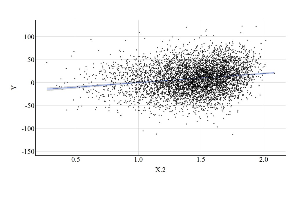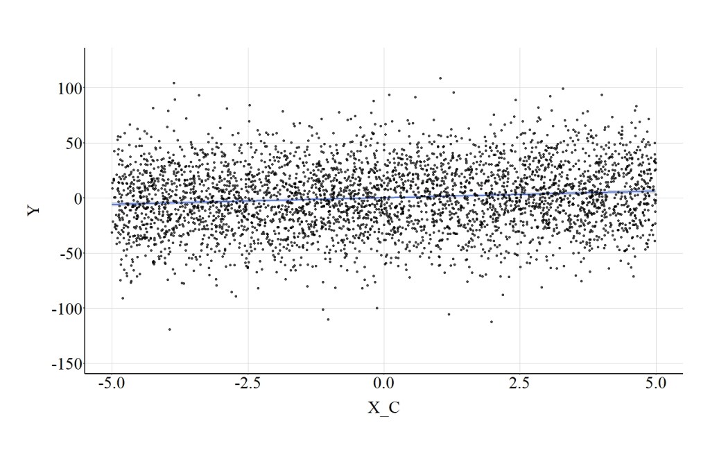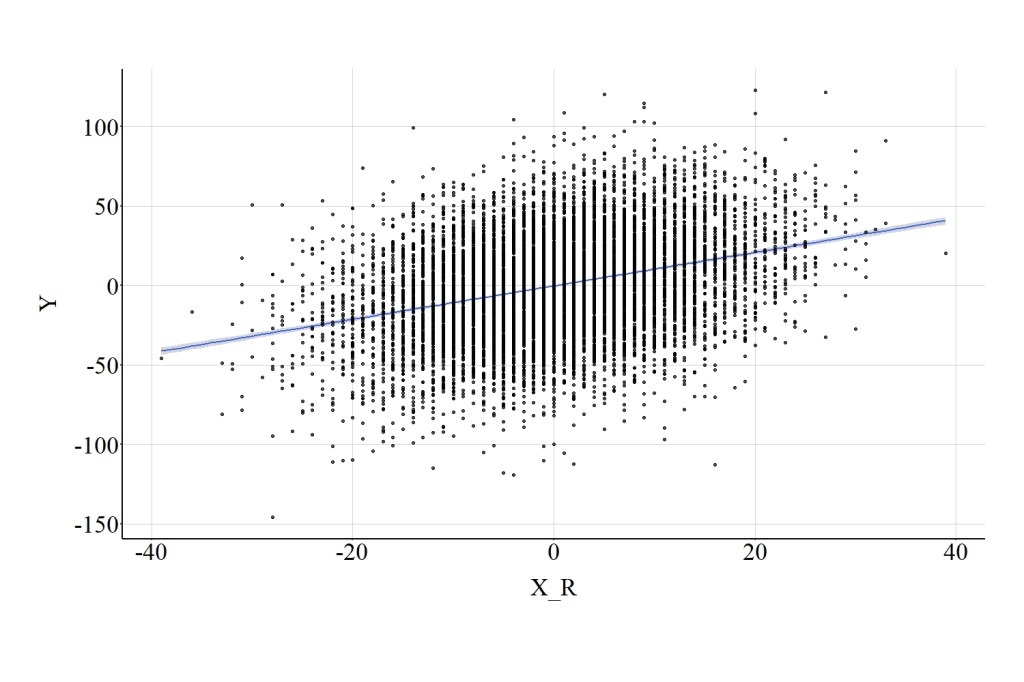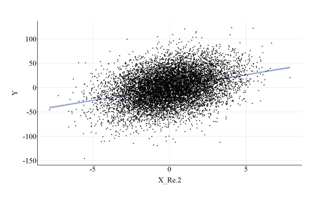 To establish a baseline, we can begin by simulating our independent variable (X) by drawing scores for 10000 cases from a continuous normal distribution with a mean of 0 and a standard deviation of 10. Afterwards, we can specify scores on the dependent variable (Y) to be equal to – or causally influenced by – the scores on the independent variable (X) plus a random draw from a normal distribution with a mean of 0 and a standard deviation of 1. Through this specification process, a 1 point increase in X will be associated with a 1 point increase in Y.