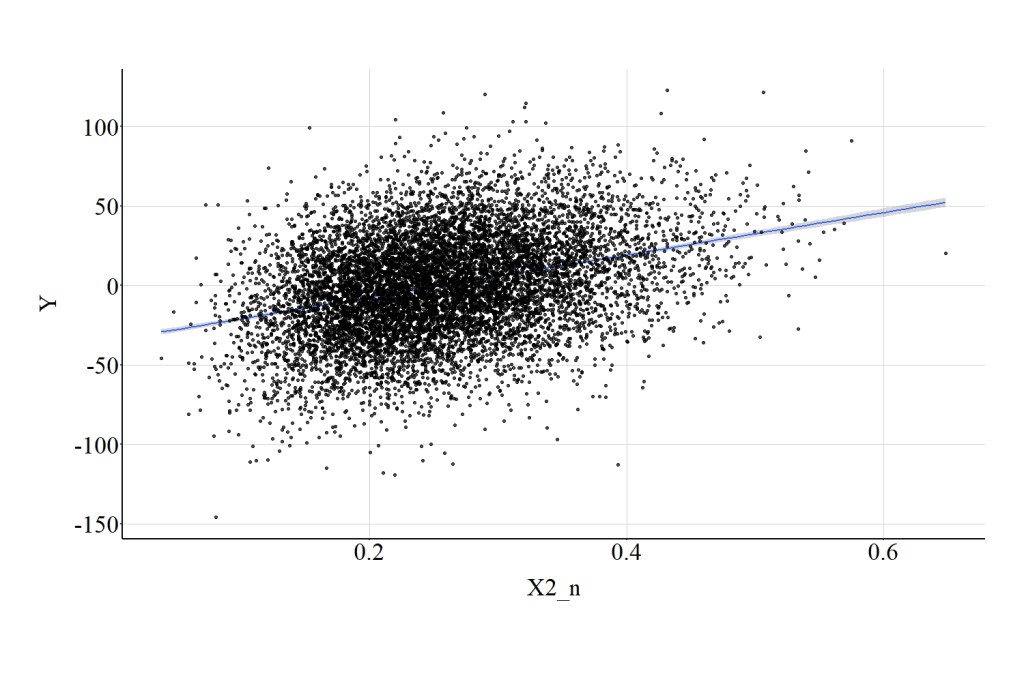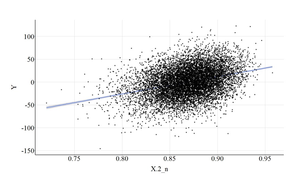 We can also normalize the distribution of X to ensure that all cases receive a score between 0 and 1. Similar to the standardized distribution, the magnitude of the association between X_n and Y is identical to the association between X and Y (Figure 11). Specifically, the spearman correlation was .31, the t-score was 35.143, and the X2-square score was 1235.034.