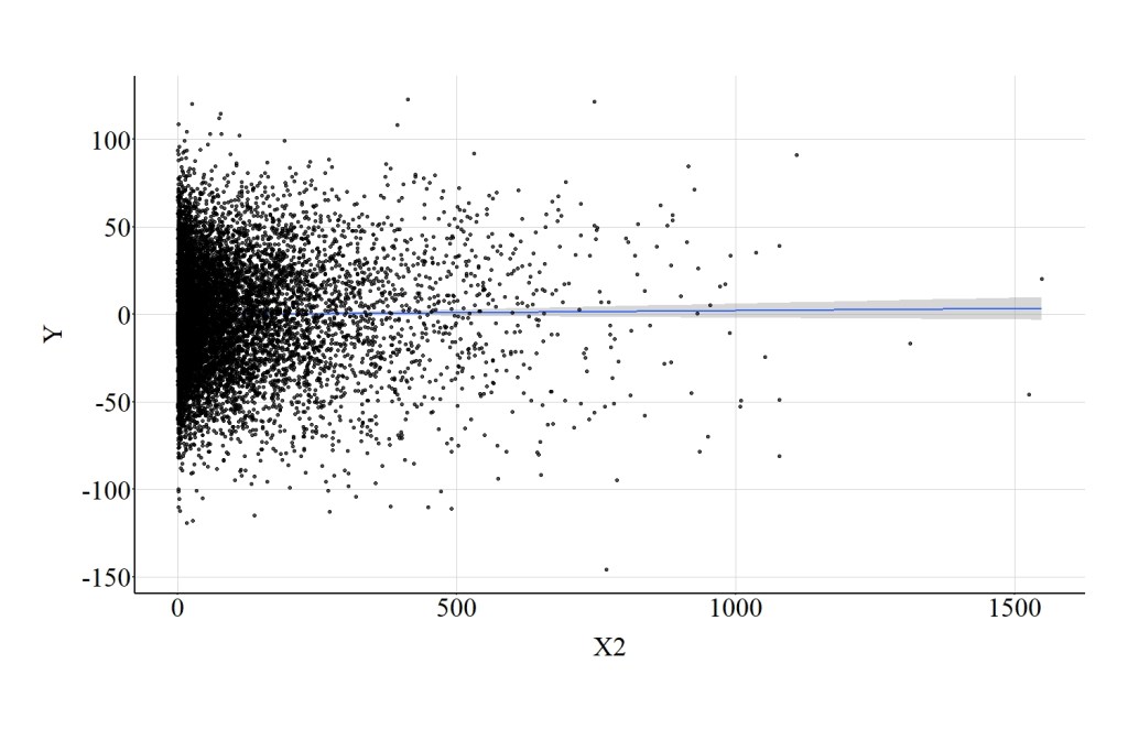 Similarly, we can multiply X by 20 to observe the effects on the association between X_Re2 and Y. Similar to the first example, the magnitude of the association between X_Re2 and Y is identical to the association between X and Y, which is demonstrated in both the test statistics and Figure 9. Specifically, the spearman correlation was .31, the t-score was 35.143, and the X2-square score was 1235.034.