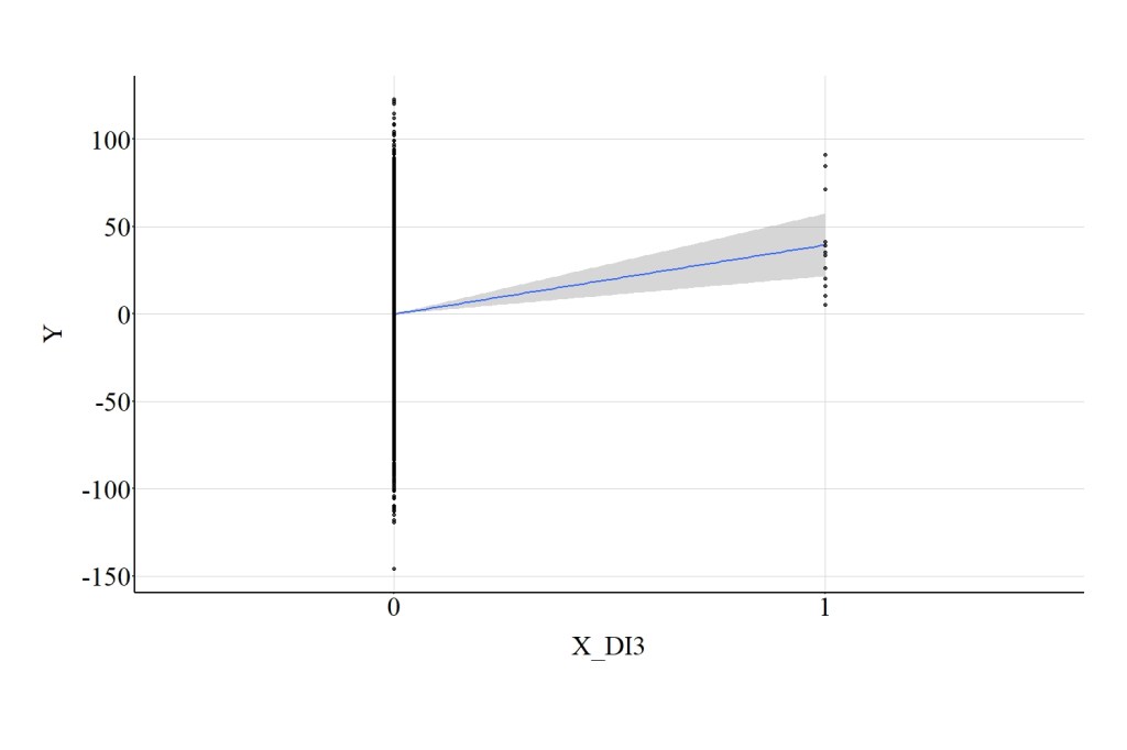 Using this dichotomous version of X, we can estimate the association with Y and identify that the association is even further attenuated. In particular, the spearman correlation between the third dichotomous version of X and Y was .04, the t-score was 4.320, and the X2-square score was 18.660. The error in the statistical association between the third dichotomous version of X and Y is evident in Figure 4, where the 95% confidence interval band (gray area) spreads out substantially as we move from 0 to 1 on X.