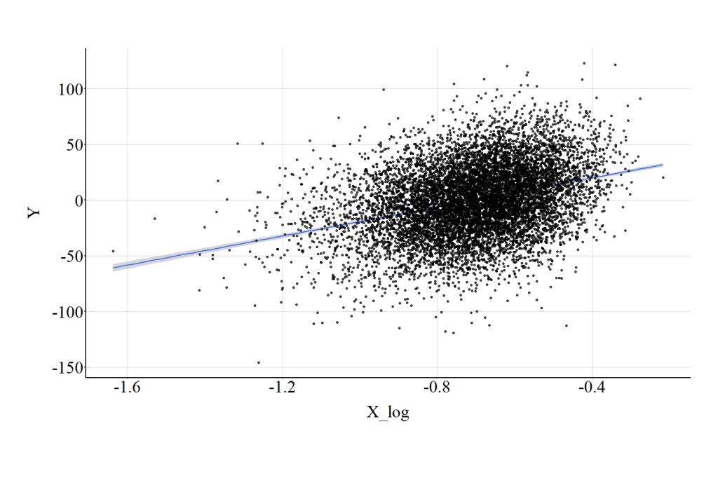 After normalizing X, we can implement a base log transformation and examine the effects of X_log on Y. The magnitude of the association between X_log and Y is slightly attenuated when compared to the association between X and Y, but the effects are largely similar (Figure 12). Specifically, the spearman correlation was .31, the t-score was 34.888, and the X2-square score was 1217.141.