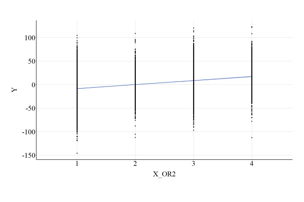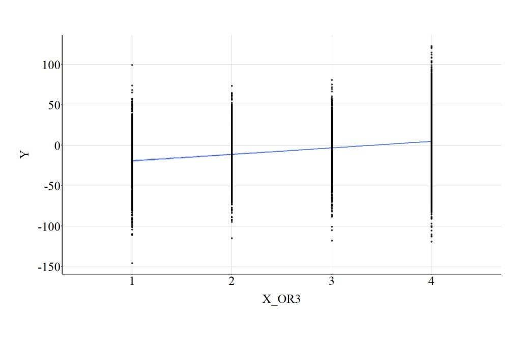 When the linear association between X_OR3 and Y was estimated, the spearman correlation was .25, the t-score was 26.559, and the X2-square score was 705.404. Figure 7 highlights that the linear regression line between the third ordered version of X and Y is attenuated when compared to the linear regression line between the previous ordered versions of X and Y, as well as the association between the continuous version of X and Y.