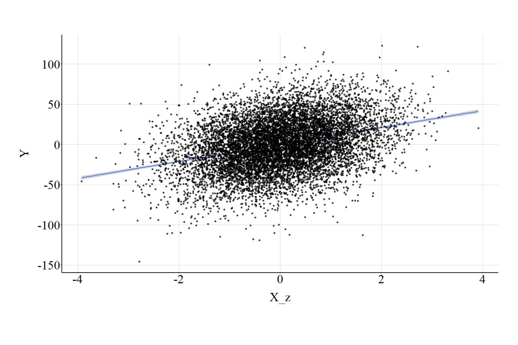 Using the scale function in R, we can standardize the distribution of X to possess a mean of 0 and a standard deviation of 1. Although the scale of X has changed, the magnitude of the association between X_Z and Y is identical to the association between X and Y (Figure 10). In particular, the spearman correlation was .31, the t-score was 35.143, and the X2-square score was 1235.034.