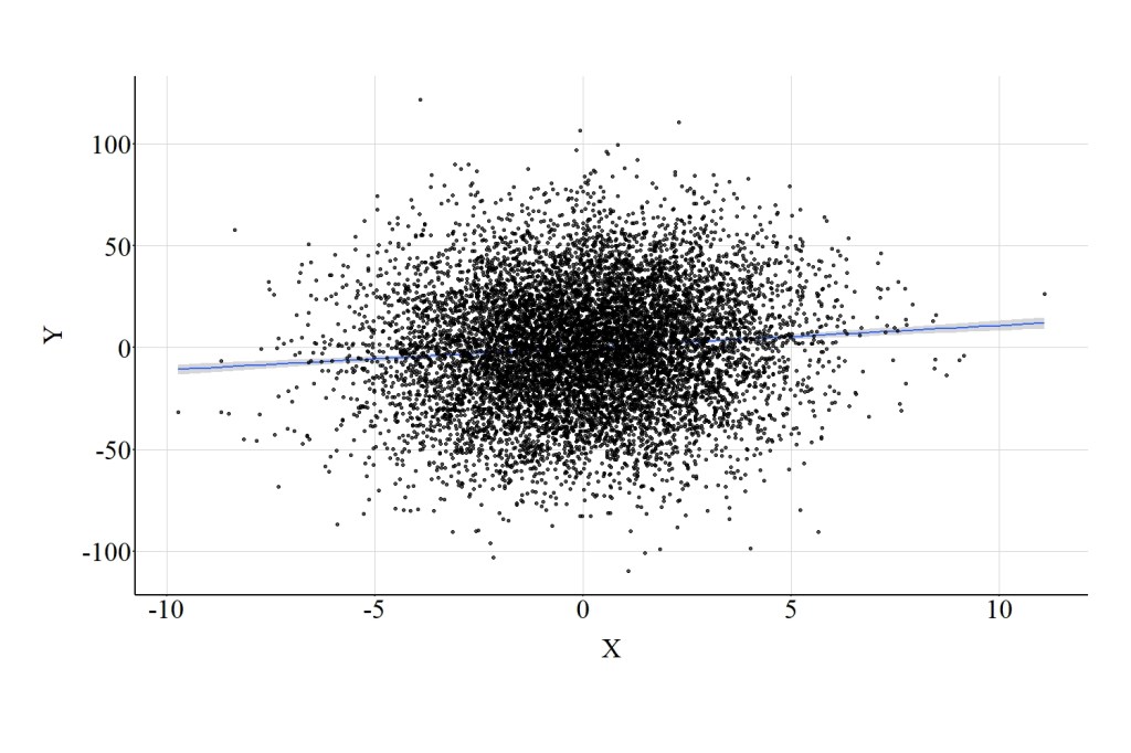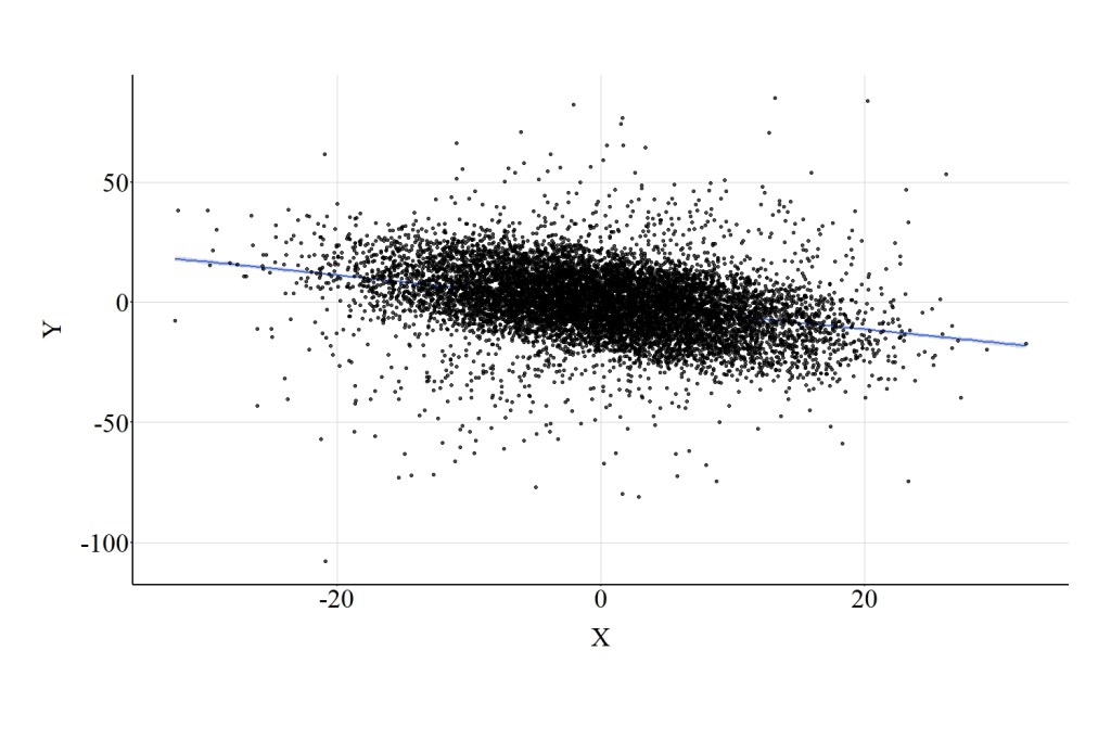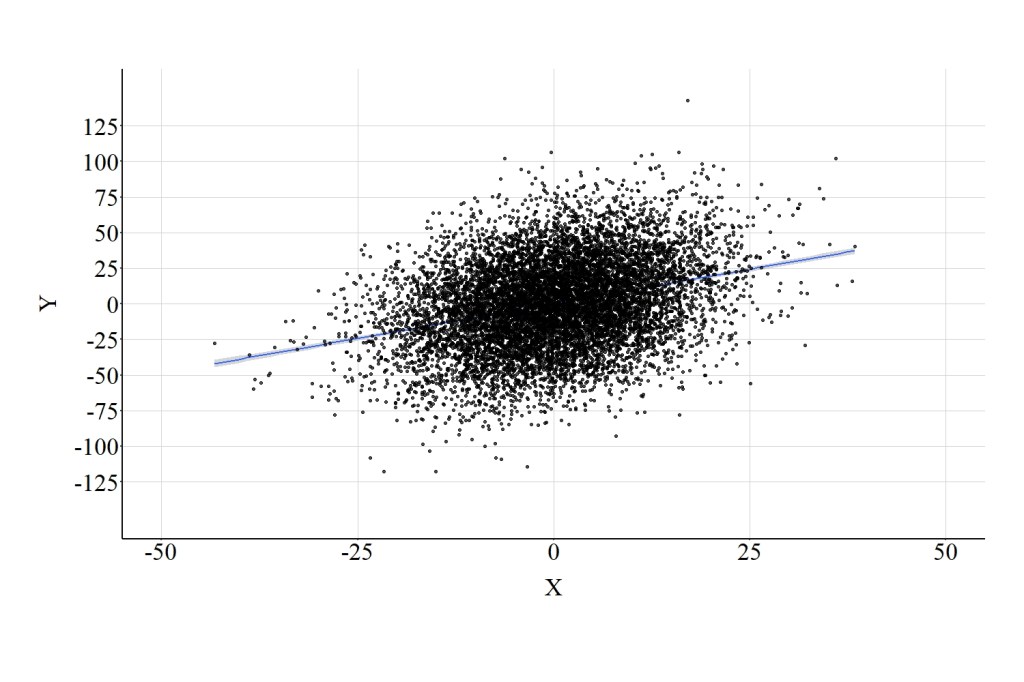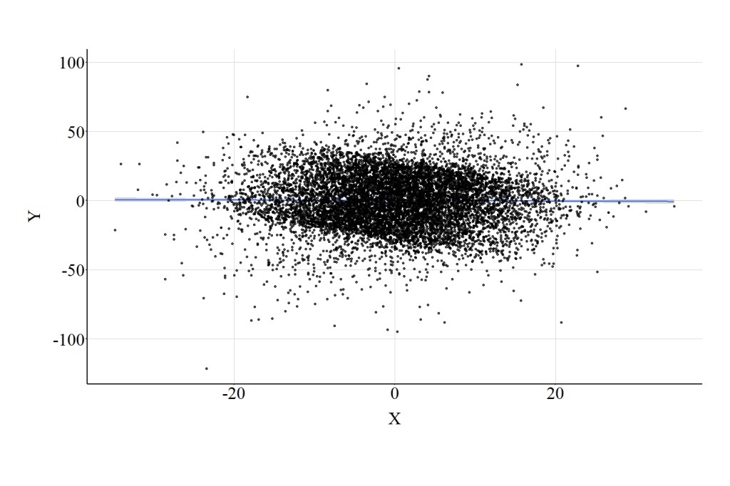 To simulate a collision, or a collider variable, we first simulate scores drawn from a normal distribution with a mean of 0 and a standard deviation of 10 to represent our independent variable (X). After which, we specify that scores on Y are causally influenced by scores on X – where a 1-point increase in X corresponds to a 1-point increase in Y – plus a random value drawn from a normal distribution with a mean of 0 and a standard deviation of 30. Finally, we simulate the collider (Col) by specifying that scores are causally influenced by X and Y, plus a value randomly drawn from a normal distribution with a mean of 0 and a standard deviation of 10. In this simulation, a 1-point increase in X or Y was specified to result in a 4-point increase in the collider.