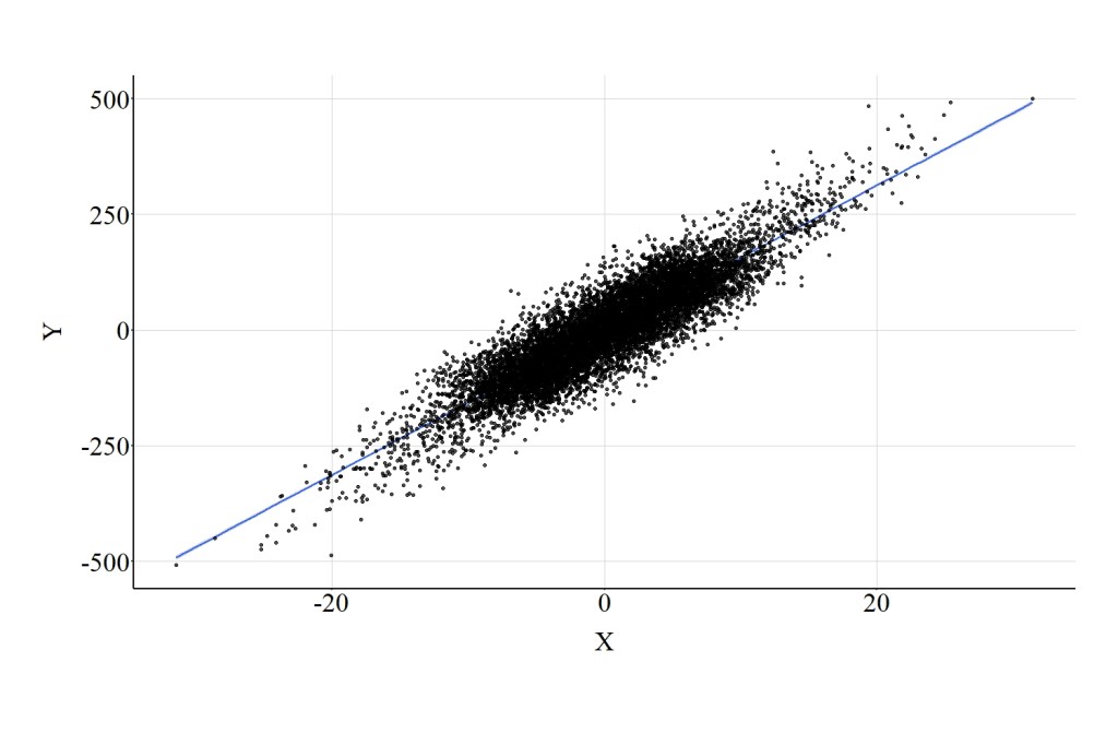 In this simulation, we begin by specifying for X to be a vector of scores randomly drawn from a normal distribution with a mean of 0 and a standard deviation of 10. Similarly, we specify Mod to be a vector of scores randomly drawn from a normal distribution with a mean of 0 and a standard deviation of 10. Finally, we specify that scores on Y are causally influenced by X plus a random value drawn from a normal distribution with a mean of 0 and a standard deviation of 30, but include an interaction between X and the moderator. The inclusion of this interaction term in the simulation creates a situation where the moderated effects of X on Y can only be observed after specifying a multivariable model including the interaction between X and Mod. The bivariate model presented below provides the unmoderated direct causal effects of X on Y, which suggests that a 1-point increase in X is associated with a .777 increase in Y. Now let’s observe how the level of measurement of the moderator influences the estimation of the moderated effects.
