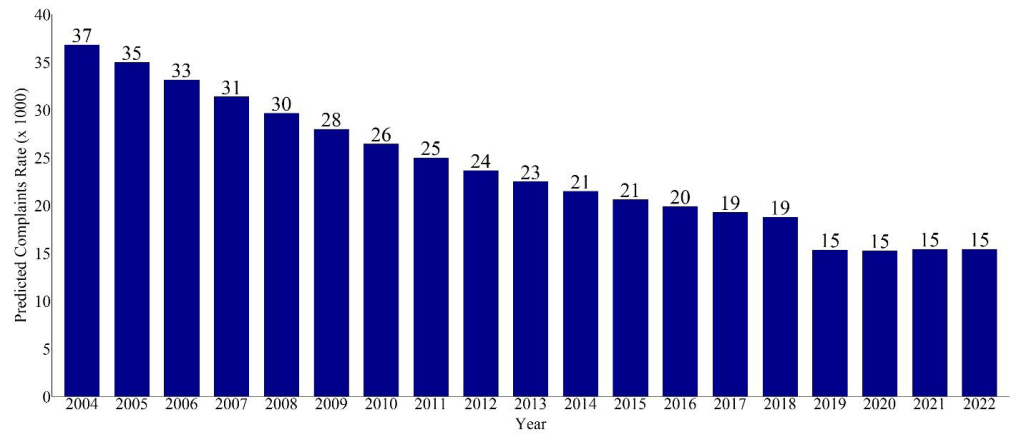 The primary reason state officials in North Carolina have encouraged the implementation of School Justice Partnerships is to reduce the number of youths referred to the juvenile justice system for school-based misconduct. Although we cannot directly examine school misconduct, the rate at which county officials refer youth to the juvenile justice system for all complaints provides the ability to approximate the effects of these partnerships on responses to school-based behaviors. The preliminary findings from the study [Preprint: https://ssrn.com/abstract=4758002] suggest that the implementation of a School Justice Partnership is associated with reductions in the rate at which youth are referred to the juvenile justice system in counties where School Justice Partnerships exist. The reduction observed was 3-complaints per 1,000 juveniles aged 6-17. This reduction means that the state-wide implementation of School Justice Partnerships could reduce the number of complaints seen by the North Carolina juvenile justice system by upwards of 4,000 complaints in the year following implementation (See Figure 1).