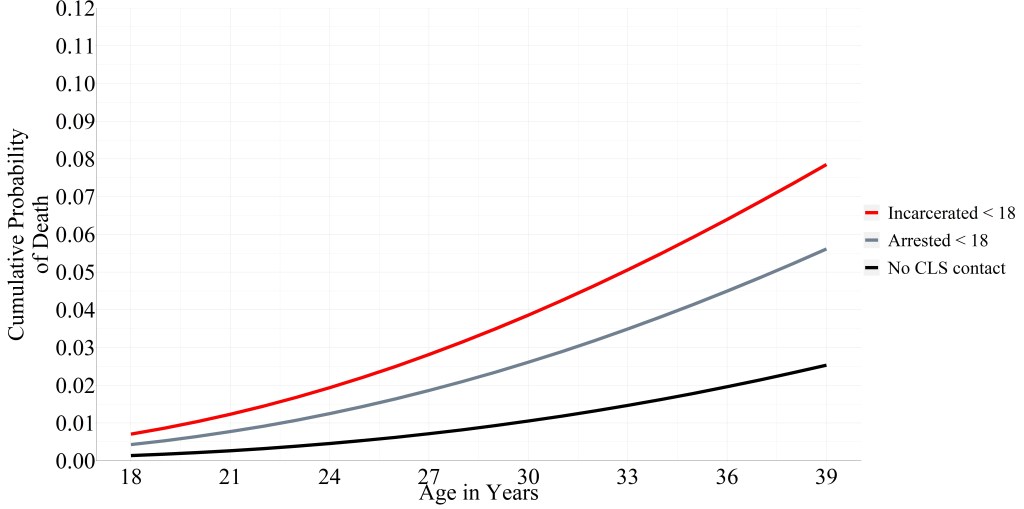 Notes: The cumulative probability of dying by the corresponding age was estimated using the results from the model presented in Table 2. Incarcerated <18 indicates ever spending time in an adult correctional facility as a youth. CLS indicates criminal legal system.