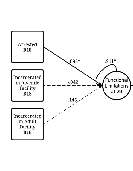 Contact with the criminal legal system (CLS) during childhood can have lasting impacts on health and well-being. While more than 400,000 children were arrested in 2020, the long-term health consequences remain poorly understood. Prior research shows that children involved with the CLS face heightened risks of poor health outcomes, including depressive symptoms and early death. However, a critical gap exists in understanding how different forms of CLS involvement before 18 – arrest, incarceration in juvenile, or adult facilities – affect functional limitations during early adulthood. Functional limitations refer to difficulties performing everyday tasks such as climbing stairs, doing chores, working, or visiting friends. These limitations can significantly shape ones’ quality of life, employment, and social relationships. A key mechanism linking youth CLS involvement to poor adulthood functional limitations may be disrupted healthcare access. CLS involved youth often become disconnected from routine medical services and face gaps in health insurance coverage. This study examined whether CLS involvement before age 18 predicts functional limitations at age 29, and whether the observed relationship is totally or partially explained by reduced healthcare access during early adulthood.