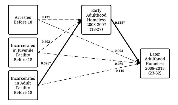 Third, incarceration in an adult facility before 18 was indirectly associated with later adulthood homelessness (2008-2013; 23–32) through the pathway of early adulthood homelessness (2003-2007; 18-27). Being arrested before 18 or incarcerated in a juvenile before 18 did not have an indirect effect on later adulthood homelessness (2008-2013; 23–32)