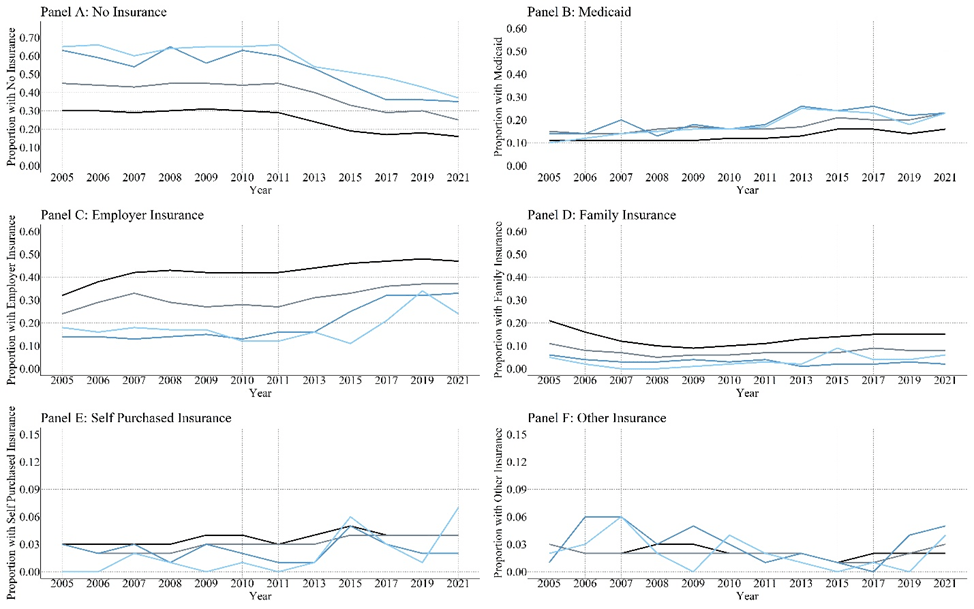 Notes: These frequencies and percentages represent the pre-imputation numbers. The number of individuals reporting health insurance source declined over time within each group. A group comparison on no health insurance was assessed using an ANOVA and a Tukey’s post-hoc evaluation.